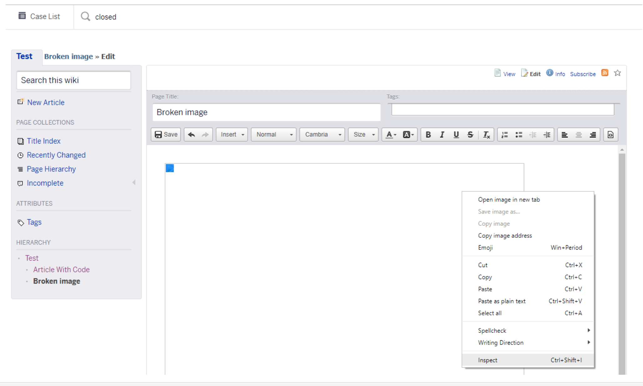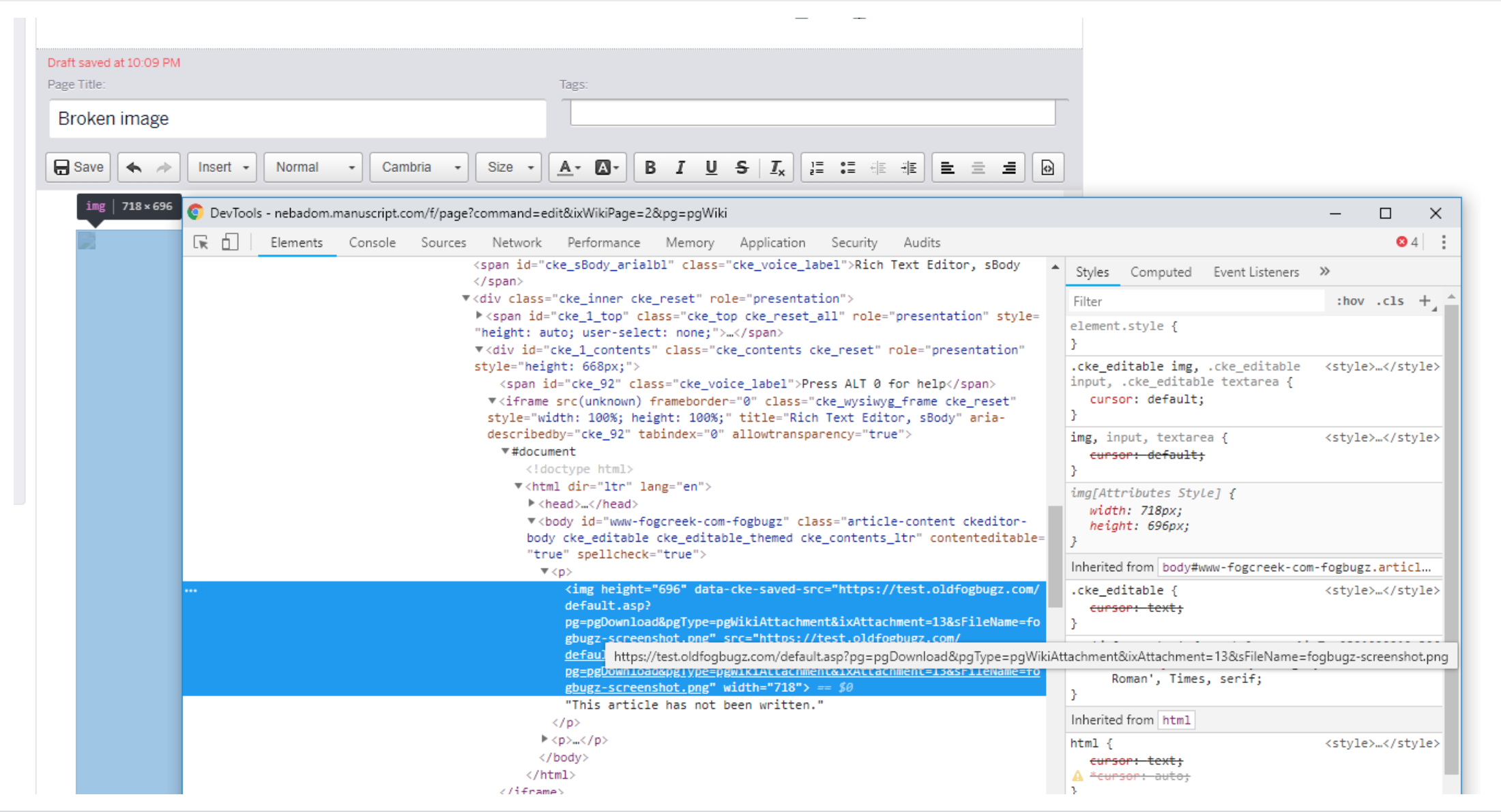 - Analyze the images in the Wiki pages (using the inspector). In this example, it can be seen that the images were referencing the old customer's domain URL.